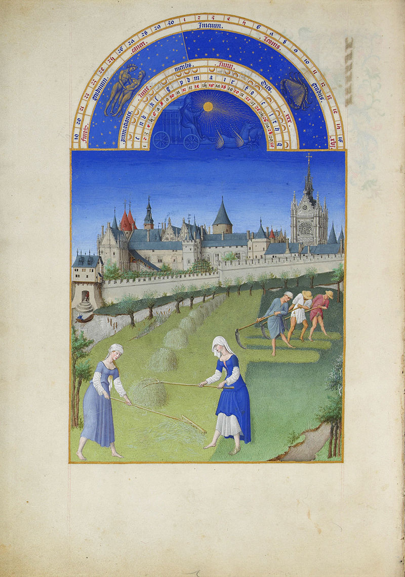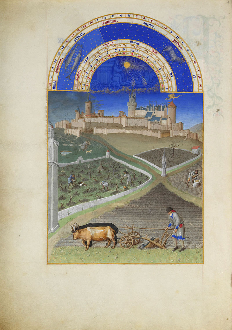 As an art historian, I found this delightful. I immediately thought of the calendar pages from the Très Riches Heures of Jean de Berry (pictured). But as a Christian, it’s disturbing. The calendar pages in a book of hours describe the rhythm of the year, and they precede the daily prayers. They’re part of a spiritual journey—through each day and through the year. In Down the Common, the year comes full circle—each season has its labors and feasts. Yet in this circle, there is no sense of the fullness of time, no sense of God’s story unfolding through the church year.